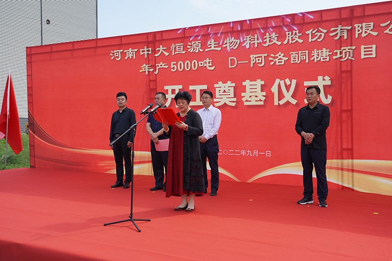 9月1日中大恒源公司舉行D-阿洛酮糖項目開工奠基儀式,項目總投資1.6個億,建設周期8個月。臨潁縣縣委副書記、縣長李俊偉、縣委常委李紅偉經開區管委會副主任邢培忠、中大恒源董事長文雁君出席儀式并培土奠基。